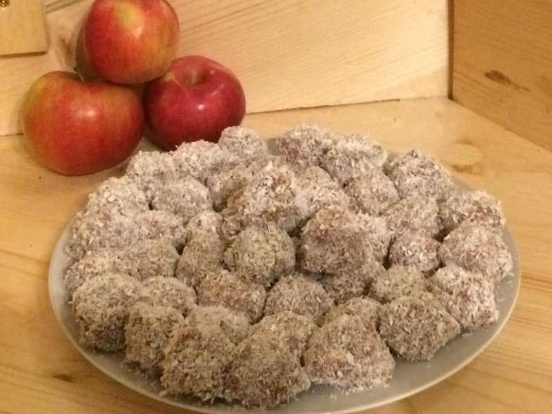 Az almát lereszeled, és kicsit kinyomod a levét (ne túl szárazra). Egy tálban összekevered a zabpelyhet, darált diót, fahéjat és sót. Hozzáadod a reszelt almát, mézet és olajat. Jól összegyúrod – ha túl nedves, adj még egy kevés zabpelyhet. Golyókat formázol belőle (kb. diónyi méretűeket). Tetszés szerint kókuszreszelékbe vagy aprított dióba hempergeted. Hűtőben legalább 30 percre beteszed, hogy megdermedjenek. Tárolás: Hűtőben kb. 5 napig eláll zárt dobozban. Fagyasztható is – felengedve ugyanolyan finom!