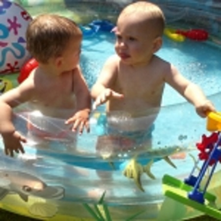 A mamáéknál készültek a képek, Nagykovácsiban, amikor végre kijutottunk "nyaralni" a sógorékkal. Nekik szinte egyidős a kisebbik gyerkőcük a Norbikánkkal, és nagyon jól elvoltak a gyerekmedencéjükben. Örömében tapsikol az első képen, a másikon gondolkodik, a bőség zavara... :) A harmadik képen épp elvett valamit Dávidkától, és olyan fejet vág, hogy "most már elég legyen, enyém és kész"!!! Zabálnivalók! Végül a negyedik képen, mint 2 jóbarát megfér egymás mellett és pancsiznak szépen.